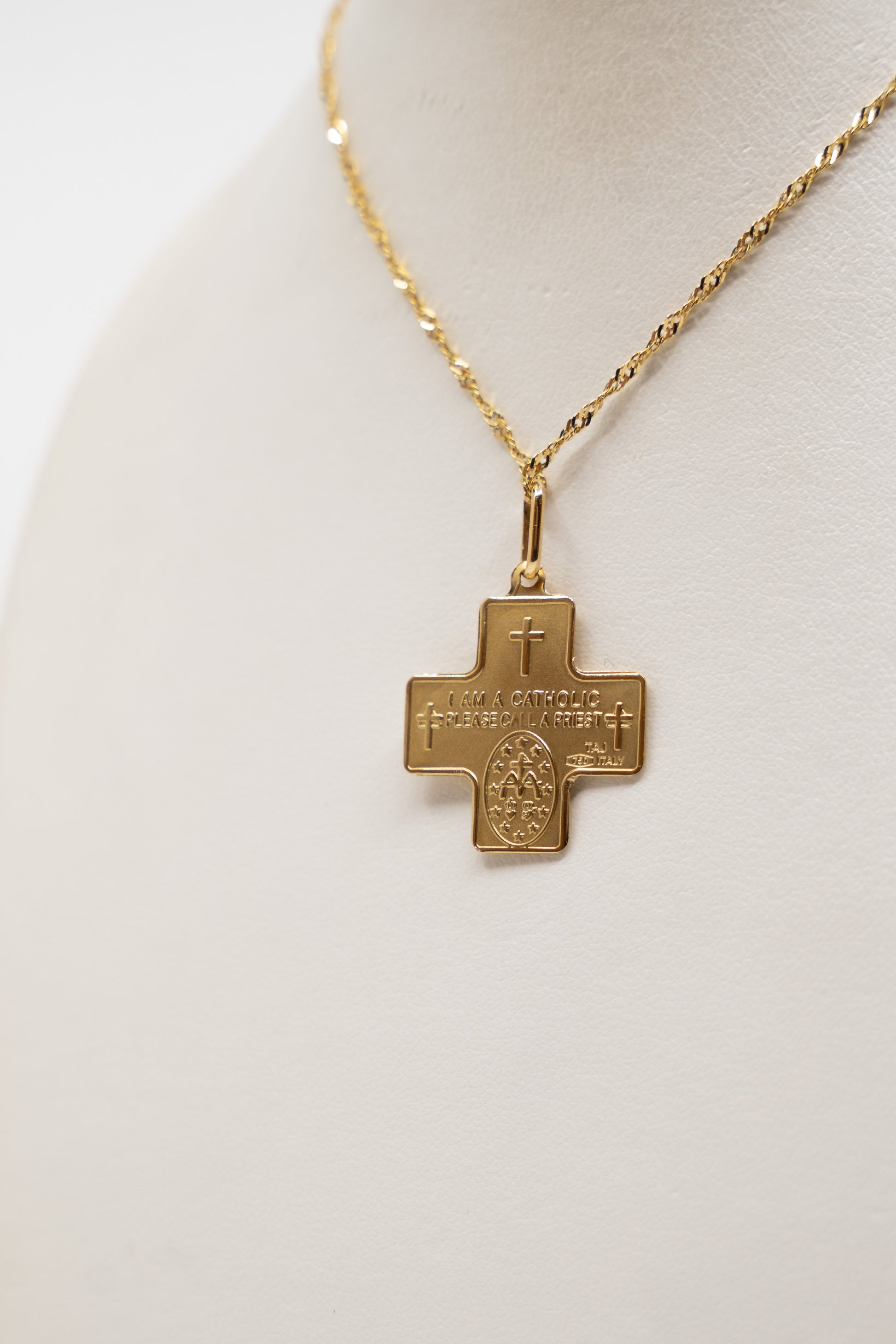 - Features the words "I am a catholic, please call a priest" on the back